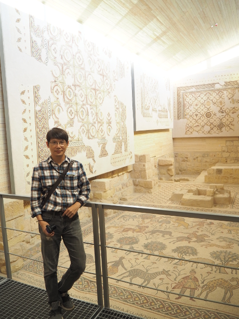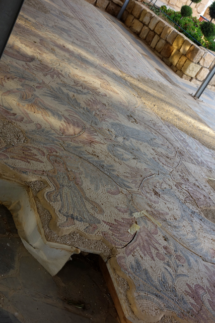 繞回的途中,我們在那塊立起的大圓盤處稍作逗留,因為旁邊有個臨時的展示場,簡易棚架下放了兩大塊馬賽克作品。它們是從山腳小鎮開挖出來的,據學者的研究,古時那兒曾有個「尼波城」(City of Nebo),因著摩西的相關典故,教堂無數,而比較小塊的,便是來自其中的「聖喬治教堂」。儘管有一半已殘毀,剩餘部分仍呈現了孔雀尾羽的華麗,葡萄藤圈繞成一個個框環,當中鑲著捐獻者的肖像,行儀的他記印了那年代的衣裝。