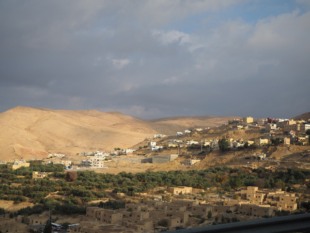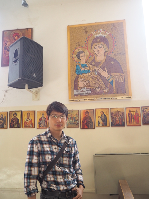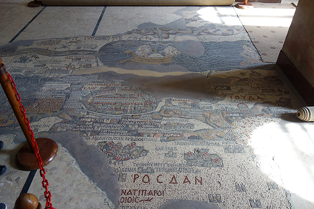 看過傳說中的湧泉,今早的行程就是拉車了,得一路朝北到接近死海北端的「馬代巴」(Madaba),這城市被地震毀滅又幾經政權交換,原本陷入了沉寂,但當十九世紀陸續掘出早年的教堂馬賽克,便因著觀光快速發展,目前已是約旦人口第五多的大城。撐過長長車途,腳觸及了地面,就彷彿欲彰顯其形象,停車場外牆就是一幅大型馬賽克,以童趣的圖樣,標示約旦的各個知名景點。從右側起始,能見船舶停靠在「紅海」口的「阿卡巴」,接續是駱駝商隊行往「佩特拉」的「修道院」,中段由於不在行程內而顯得陌生,另端幾個名號倒很熟悉,有我目前所在的「馬代巴」,下午會去的「尼波山」,然後是首都「安曼」與古城「傑拉什」。