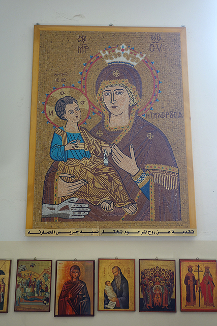 聖像屏依著傳統,右為耶穌,左為聖母,更側處對應著教堂名號,描繪了「聖喬治」持槍躍馬,斬殺惡龍。儘管屏頂沒有惑人目光的捲繞堆疊,就是一整列微縮的耶穌生平彩畫,似也沒多少人在乎,畢竟大夥走到此都是低下頭,望著那被框圍起來的地面馬賽克。經學者考據,這整片拼磚屬於六世紀的拜占庭教堂,在當年極受矚目,然地震不僅重創了「馬代巴」,也傾覆了教堂,曾讓無數信徒訝嘆的作品就這麼被砂石覆掩,長逾千年。