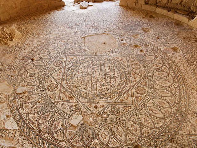 隨著領隊在街頭行走,路上經過的某棟石砌建築被後方清真寺襯得惹眼,引我端起了相機,事後才知,它是這兒的考古博物館「Madaba Archaeological Park」啊。雖稱博物館,其實是個仍在持續開挖的遺跡,原本被私人建築掩蓋,經過政府長年的收購,才終於買下整個街區,得以在統整後對外展示。據說最精華的是中處那棟,它罩覆了八世紀的「聖母教堂」,殿心有著環圈相接的幾何圖騰,撩目中透顯巧思。門廊也令學者訝異,因為在下方又找到更早期的大宅「希波呂托斯廳」(Hippolytus Hall )。