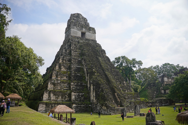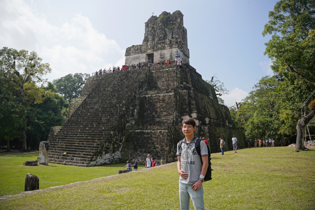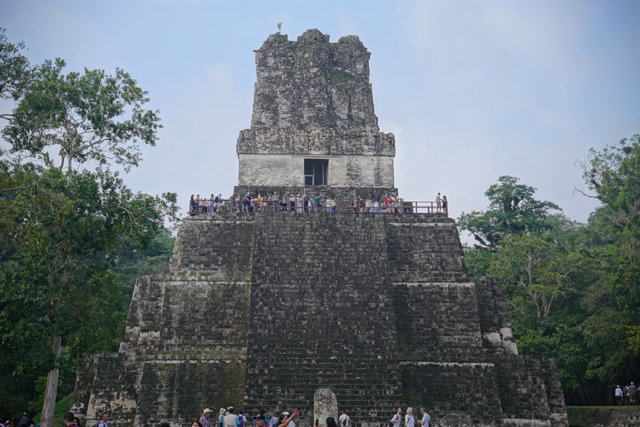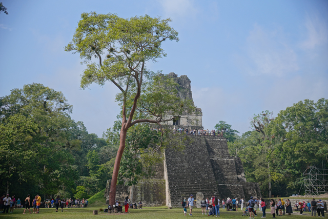 等了一陣,本以為講解完便會登上「中央衛城」,在探索中欣賞高塔,哪曉得好像沒這規劃,隊伍就如此直行,穿進最核心的「大廣場」(Grand Plaza)。即便失落,被編為「Temple 1」的這座錐塔卻有種幻力,當正面現顯,便洗去多餘情緒,只剩沉迷。四十七公尺高的它以九層台座漸縮堆築,呼應著九重的地底世界,台頂像戴冠般砌了祭殿,又往上探生被稱為「roof comb」的板塊。立板看似厚重,其實有格狀鑿空減少負擔,且已斑剝的表面本有王的浮雕,遠望就像高踞在巨大王座,相當威風。