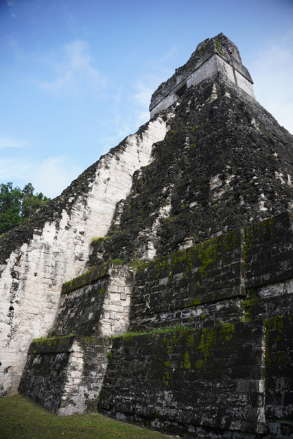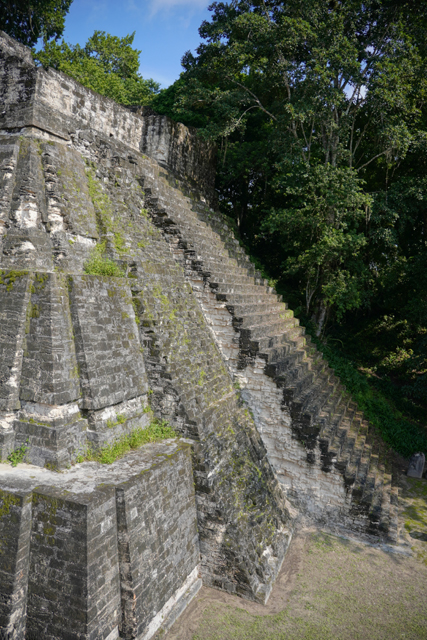 這樣的形象也令其成為這片「佩藤盆地」的建築風尚,被學者們以「佩藤風格」(Peten)歸類。而除了別緻脊冠,誇張陡度也為特色,正面的階梯就像種勇氣試煉,很令人懷疑當年的君王祭司都不曾腳殘?就算上去相對穩當,下行很容易就釀成悲劇吧,也不可能用爬的淪為百姓笑柄。胡猜著,盯看著,就不免想登高體驗,可惜這樣的舉動很早就被禁止了,且禁令在這幾年快速蔓延,早期還有不少遺跡可登高一覽全貌,現今能爬的寥寥可數。