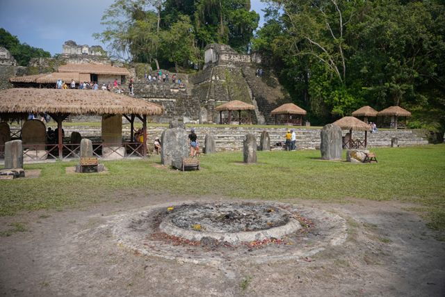這些石碑不少是八世紀時,被統治者收來集中擺列,有種展現威勢的意圖。本該跟祭壇石配對,一如兩錐塔前的配置,然棚下的幾乎都孤零零,失了伴侶。而為了一顯專業,老師開始鉅細靡遺的講解,原先我還滿認真聽講,當一堆很難記的年代、王名不斷灌入,就開始左耳進右耳出。見老師有請領隊錄影,我就飄走了,在廣場轉繞,以不同角度欣賞捕捉塔廟身影,也研究場中央的圈環石台,似乎當地人現今還會來舉行儀式,能看到些不明物的殘餘,並傳出奇詭的味道。