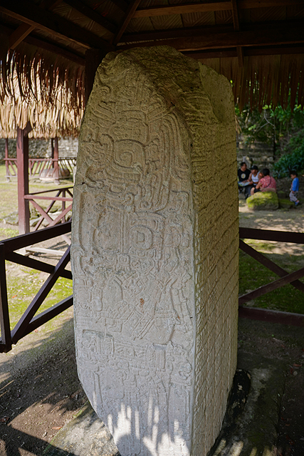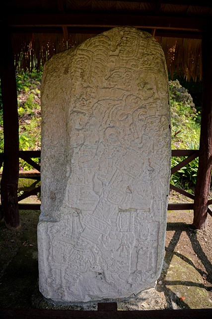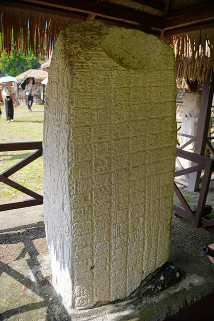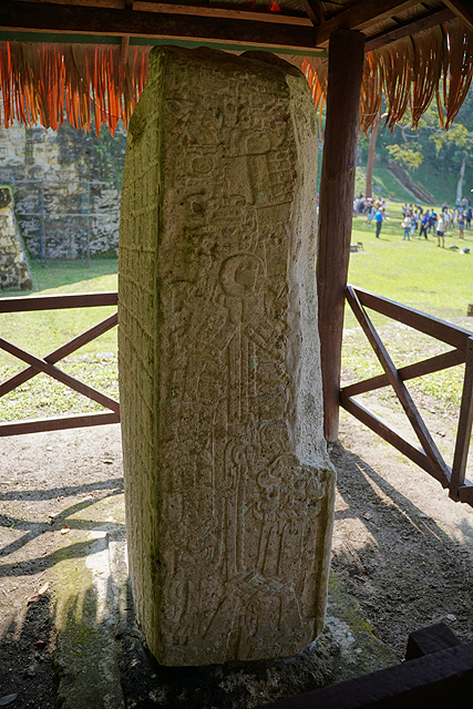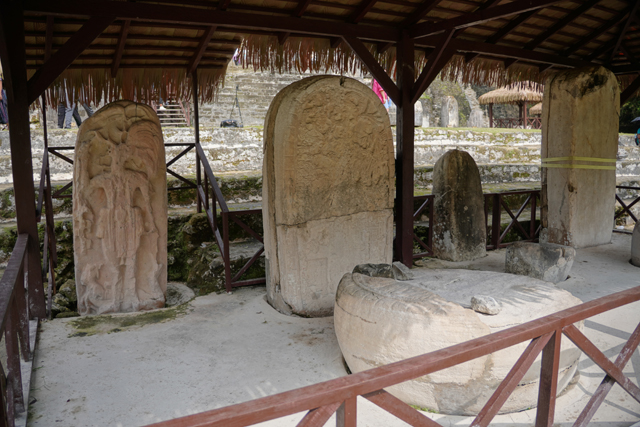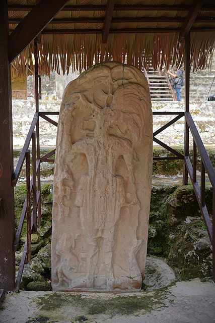 中央大草棚內收置的相對多,最左的「Stela 10」記錄了第十九代王「Kaloomte’ Bahlam」,不過有王室血統的應是妻子「Lady of Tikal」,學者推測他可能是位將軍,因娶了王女而共治。石碑的細節、人物面目已難辨,身形則因深刻而清晰,能看出他正踩著俘虜。有趣的是,由於頭部只剩飛揚的羽飾,最早他就被這麼稱為「捲頭」。