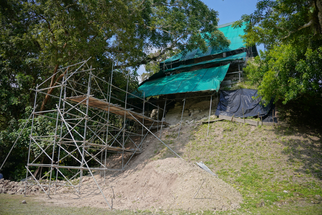 其實前排中軸本該有「Temple 33」以三十三公尺高偉立,搭配同伴的翼展,是與廣場雙塔相競的風景。可惜狀況太差了,考古人員乾脆把它清除,研究內部。會想這樣是因為馬雅有著奇妙傳統,後代不會把前人的塔座拆掉,只是再包一層,不斷套疊後,開挖便常有驚喜。像「Temple 33」便有三層,綻露的第二層樓梯兩側殘留大幅雕刻,被保護在高處的幾個草簷下。