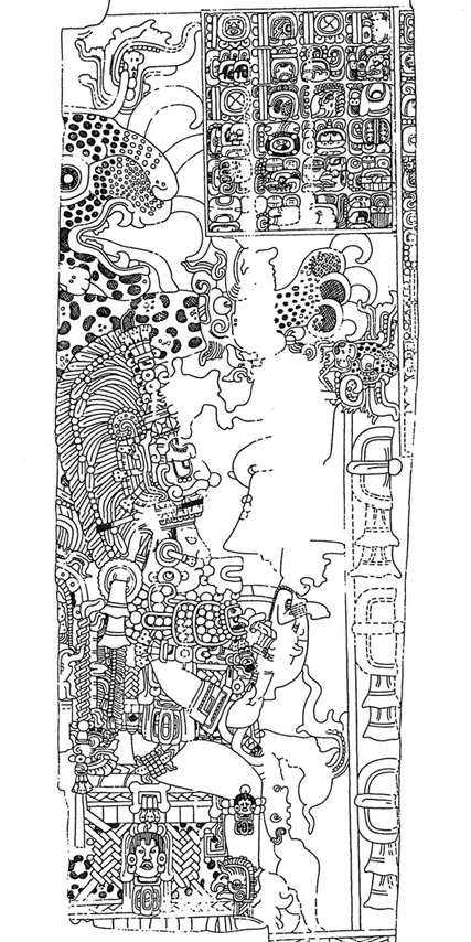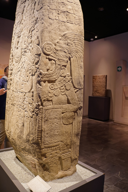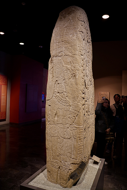 「Stela 5」就滿考驗眼力了,上半部幾乎崩殘,僅能看到延伸的羽毛、美洲豹尾跟玉珠項鍊。但它記錄的第二十七代王「Yik’in Chan Kʼawiil」還滿重要,因為是「Jasaw Chan Kʼawiil」的兒子,當政時延續父親擊潰「卡拉穆」的實力,很可能城邦人口已破十萬。搭配的文字不免提及了父母,且註明石碑是為「4 K’atun」所製。所謂的「K’atun」是馬雅曆法中「長記年」的第二位數字,約莫為二十年,這週期對他們很具意義,因此都會特別慶祝。
