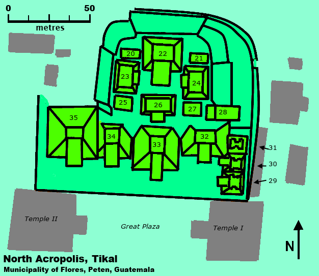 在這列石碑之後的是「北衛城」(North Acropolis),與「中央衛城」互望。相對後者為矮屋的錯生,這區全是金字塔,雖比廣場兩端的「美洲豹神廟」、「面具神廟」略小,立於坡上集結成陣,仍有著重嶺氣勢。這區是「提卡爾」早年的核心,從「前古典時期」便開始經營,塔底散佈著值得探勘研究的墓室,位處中心的「Temple 26」,便葬著目前最早能追溯到的王「第一階梯鯊魚王」(Yax Ehb’ Xook)。而前排中央偏左的「Temple 34」,主人就是常被提及的「捲鼻王」。