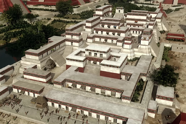 想像之際,老師介紹了設於近處的球場。這個中美洲的特色運動據說三千年前就有了,馬雅聖書《波波烏》(Popol Vuh)便記述了相關情節,它從創世神話說起,講至雙生子英雄「Hunahpu」、「Xbalanque」的冒險。他們進入冥界,經歷死神的各樣詭計挑戰,當中便有在球場的比拚。也因為這樣,打球在馬雅便不只是賽事,而是種祭神儀式,代表光明與黑暗的對抗。選手會穿戴護具,僅使用髖、肘、膝擊送橡皮球,要在球不落地的條件下抵達對方陣地。到了「古典晚期」,兩側斜牆又添了石環,增加射門難度。