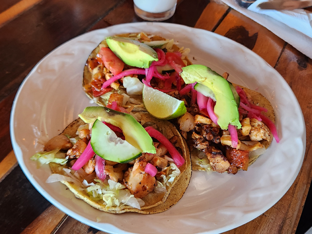 近海餐廳理所當然以海鮮為主,怕吃到地雷的我就點了素食。本以為這蔬菜盤列在店家的special裡應該特別,哪知就是滿滿的根莖類和花椰菜,而且還賣台幣三百六,很令我傻眼。相較之下,隔壁的酪梨炸蝦taco視覺可口多了……