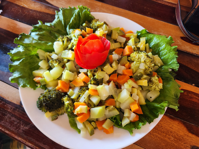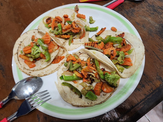 上車回到「華拉度列」,今晚仍舊住在這兒,幾個相熟的對吃的都沒想法,便還是到美食廣場報到。在攤位來去瞄了片刻,由於被昨天乾乾的烤豬排傷害過,就打安全牌點了蔬菜taco,結果端上來的跟中午類似,陽春得令人傻眼,青椒、紅蘿蔔、花椰菜,墨西哥是種不出什麼葉菜喔……
