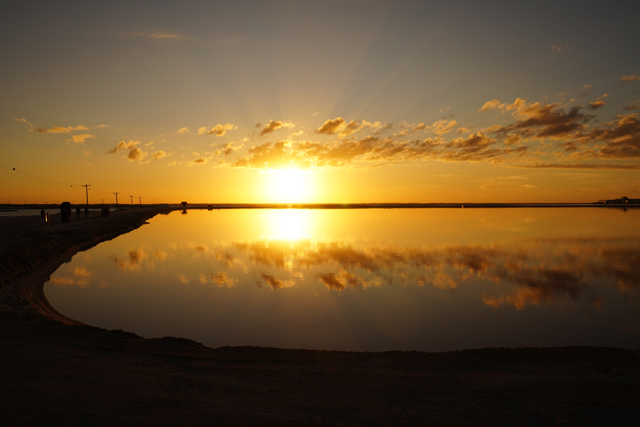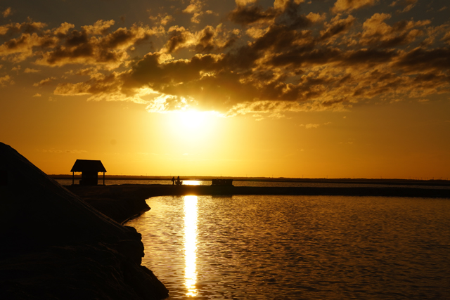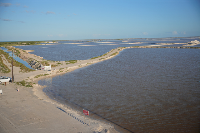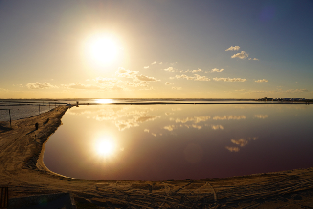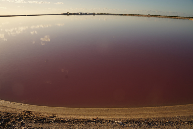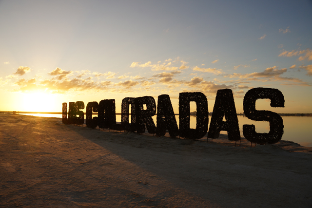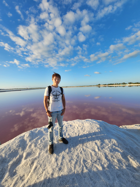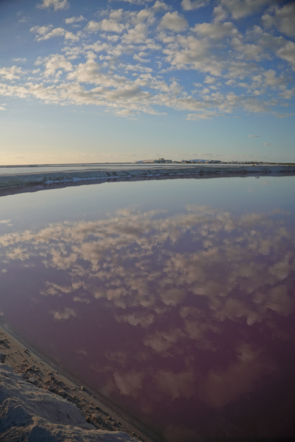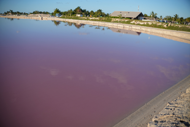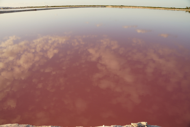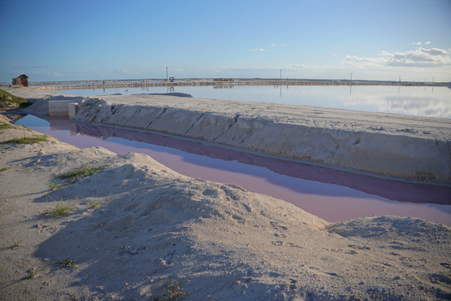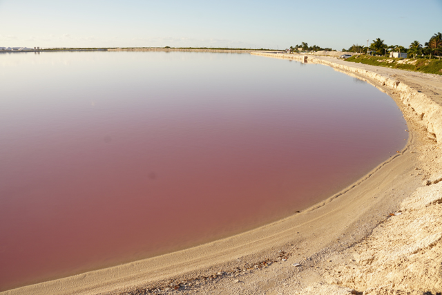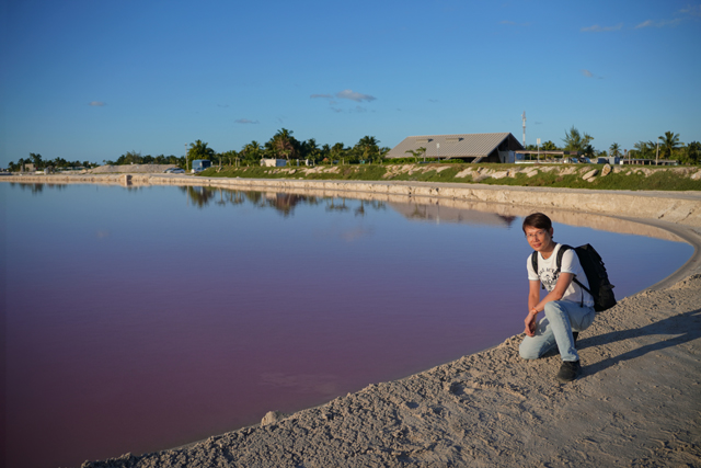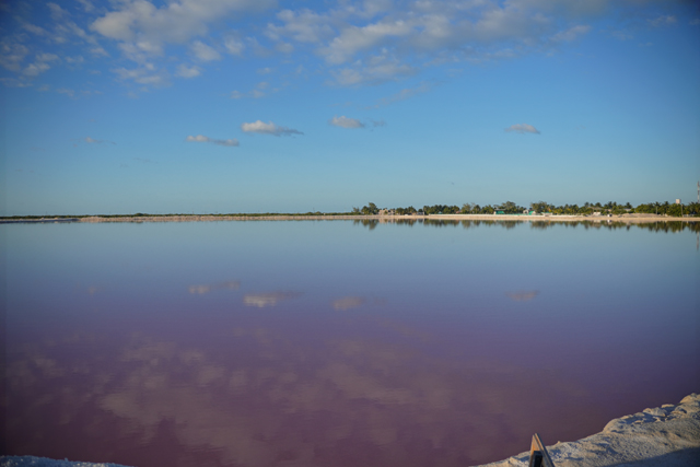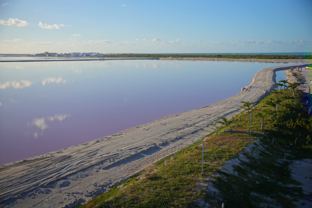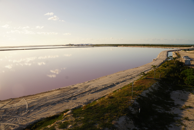 最末一站是離「Río Lagartos」不遠的「粉紅湖」(Las Coloradas)。它其實是個曬鹽場,因某區水色在陽光映射下偏粉紅,就陰錯陽差成了網美景點。在車上瞥著路邊漸趨密集的小鹽丘,好奇留意著水色,我抵達了入口。由於爆紅,觀光財不賺白不賺,進去得先繳門票錢,且會有當地導遊帶著,美其名講解,主要應是留意是否有人沒品搞破壞。