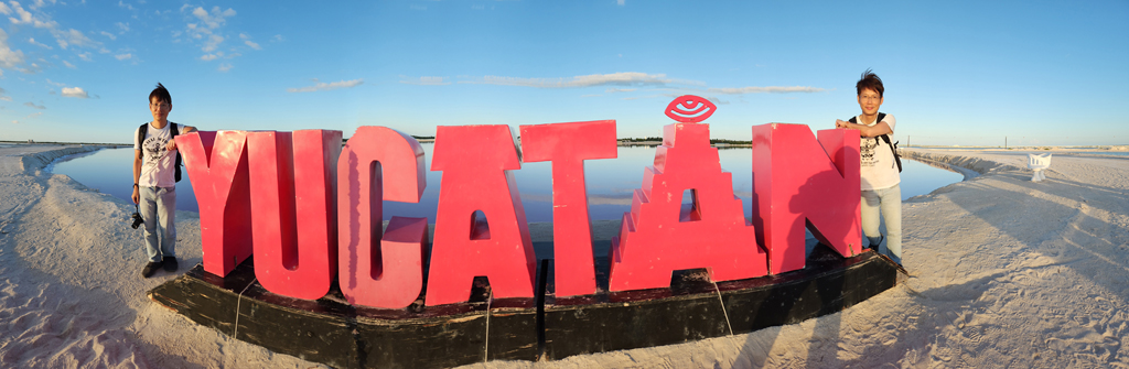 或許是為了應景,岸邊堆了個小鹽山,上去後園區導遊會幫大家操刀。由於他好像有兼職拍婚紗,花樣還滿多,會拿另台手機把鏡頭遮一半,利用螢幕反射把大家拍出鏡像倒影。不然就切全景模式,要人在「Yucatan」的字母大logo兩邊跑,製造出分身。團員輪流玩了一陣還挺歡樂。