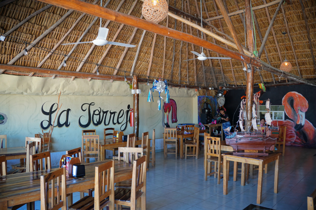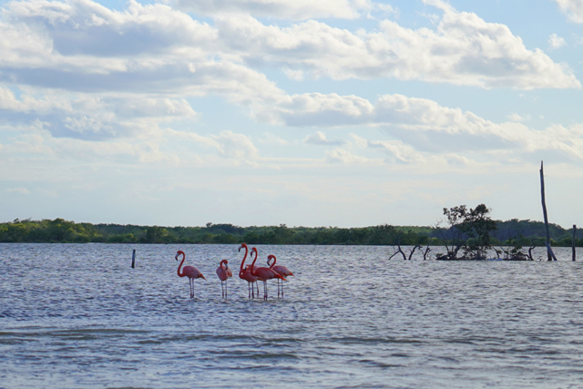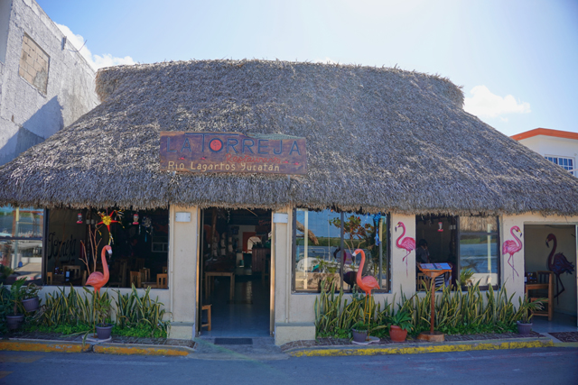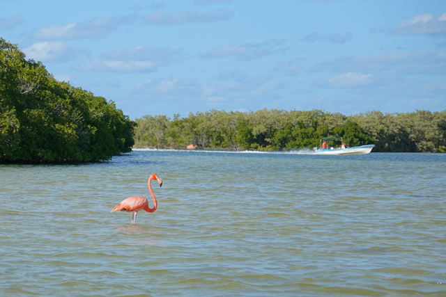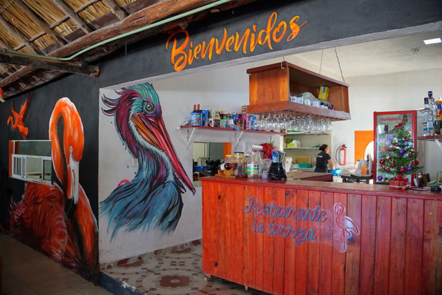 看過「Ekʼ Balam」,下個目標是「猶加敦」北海岸的兩個景點,一個是觀察生態的潟湖「Río Lagartos」,另個是滿奇特的「粉紅湖」。坐船前先在渡口大街的餐廳吃午餐,它應景地在門面擺了紅鶴雕塑,店裡也有頗多鳥類彩繪,筆觸生動且瑰麗。吃到一半還瞥見蜂鳥被店家擺設的水果吸引,大夥興奮地相互通報。可惜太小隻又逆光,我努力搶拍,只得到兩張不知所云的照片。