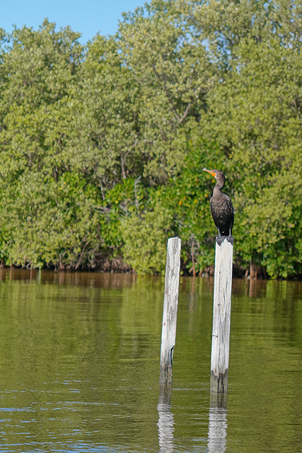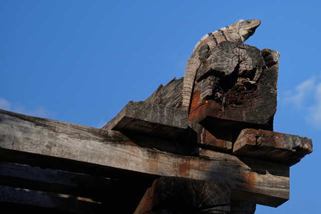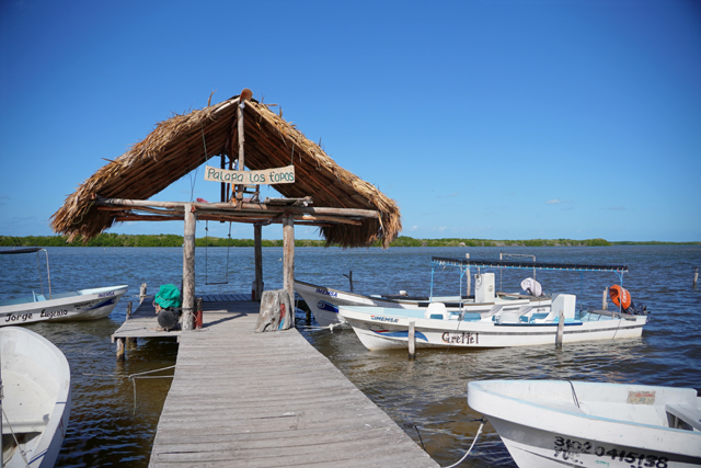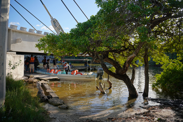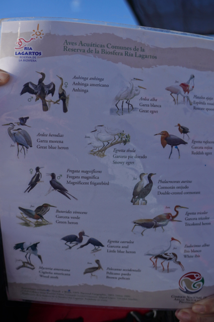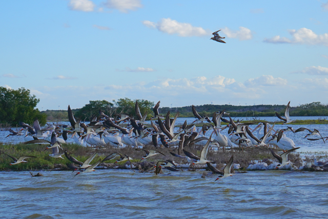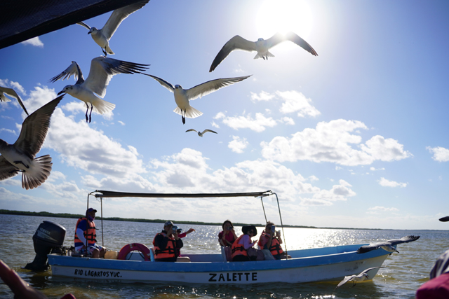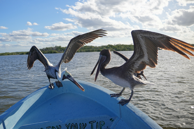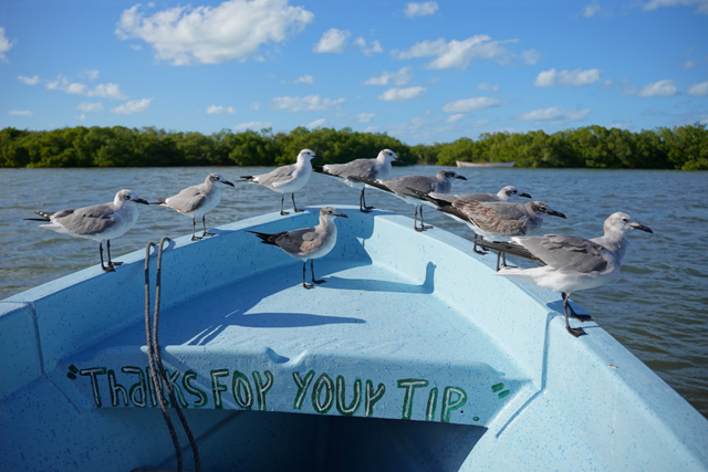 吃完在渡口曬著太陽,隨便望看草簷涼亭於水岸綴點的風景,須臾,船家過來接我們了。身為生態區的「Río Lagartos」果然不是唬的,才剛啟航,就有海鷗機靈飛來盤旋,見人遞出零食就迅速俯衝、叼走,相當兇殘。吃就罷了,還會順便排放炸彈,很沒品。不過看牠們偶爾在船頭停歇,同方向排隊,仍挺有趣。