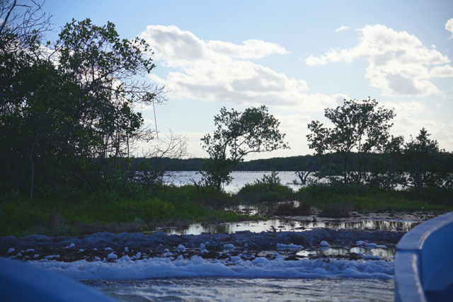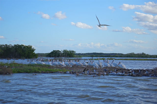 玩弄欺負鱷魚好一陣,船隻駛近一區灌木堤岸,這邊不知為何浮堆了泡沫,很令人懷疑是否被汙染。奇的是只不過一堤之隔,對面居然是水鳥們的家,彷彿泡沫還使牠們過得更加滋潤。好幾隻紅鶴在此群聚著,鵜鶘數量更多,一些紅嘴喙的小鳥與牠們湊一起,偶爾會像被誰驚擾,齊同飛起,帶出振翅聲響。