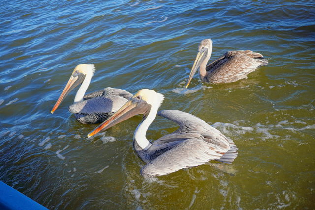 窩巢區便差不多是這趟生態之旅的終點了,折返時,有好幾隻鵜鶘游了過來,相比海鷗近人是為了果腹,就算停在船頭也保持警戒,鵜鶘就似乎把我們當背景。躍上後傻楞楞地站在船頭休息,看不出有期待餵食的意圖,鏡頭都快貼到臉上了也沒想躲,可能是沒被人類傷害過。