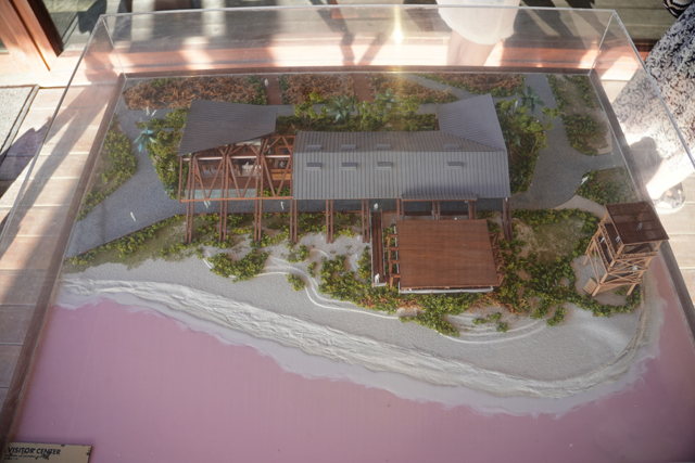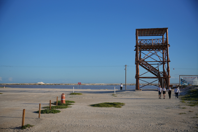 入口設有小小的紀念品店,老師說裡頭的絨毛小紅鶴很便宜,惹得大夥一陣瘋搶,店員八成覺得莫名其妙。掃光後,大隊往園區推進,第一站是有人數限制的瞭望塔。領隊事前就有打預防針,粉紅的程度每天不定,水質、鹽份、光線都是變數,一切憑運氣。結果,我們是運氣不佳的一群,當爬上塔頂,眼下的池鏡大多仍是與天空相仿的朗藍,只有湖緣被渲染成紫,離網路圖片那夢幻的粉紅頗有距離。