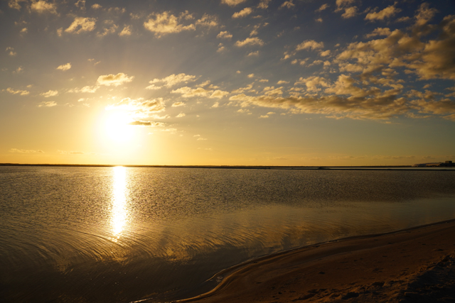 在這樣的瞎鬧中,天色逐漸轉為橙黃,日輪朝著遠方堤岸落降,也招喚湖中的雙生伴侶與它合而為一。雲朵亦於兩個界域鏡像散抹,似放肆燒燃後的滾滾墨煙。