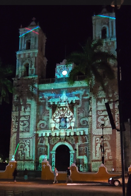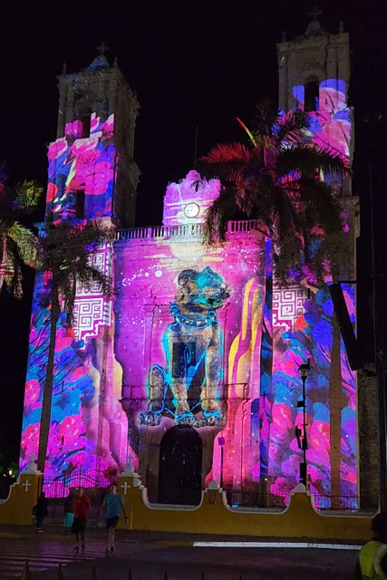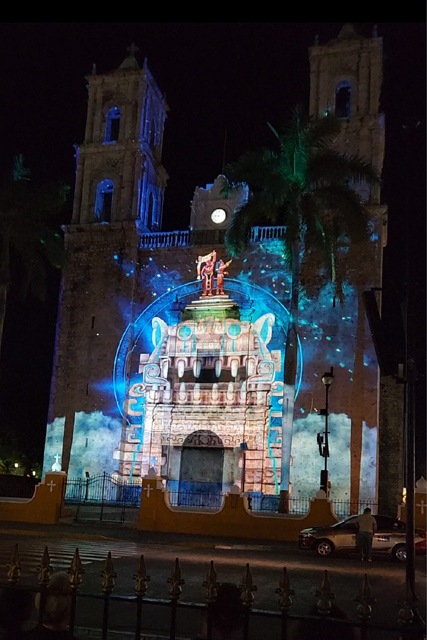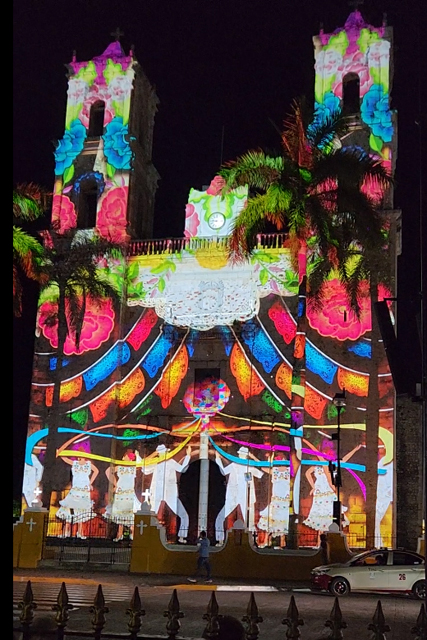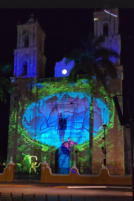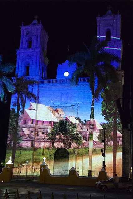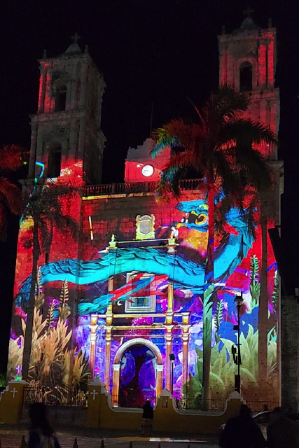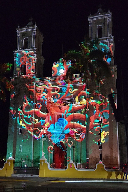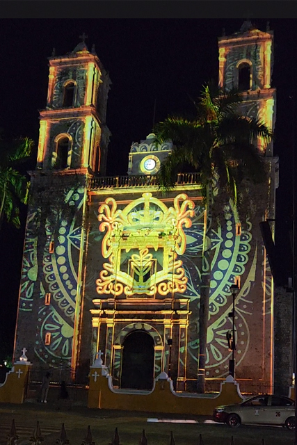 根據資料,十八世紀當地馬雅人曾發動起義,殺了很多在教堂避難的官員,鎮壓後,當局嫌晦氣褻瀆,就在隔年建一座新的。目前的它有著雙塔立面,裝飾依舊持著素簡,僅於中央的門拱壁柱雕了花藤浮刻。入夜時分,自然已是謝客了,緊閉大門將內裡的祭壇佈設藏匿成謎,但不知為何,今晚的大教堂多了光雕投影,把它塗繪得異常斑斕。