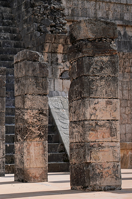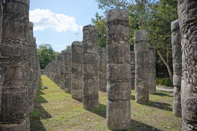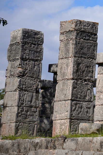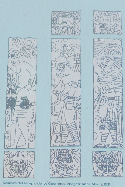 這一區被稱為「千柱廣場」,因著「戰士神廟」前的柱列往旁繼續延伸,將其包繞。有文章以兩千名戰士浩浩蕩蕩行往神廟作形容,然也不知是過於誇飾還是崩毀的緣故,似乎只有靠外的方柱才帶雕刻,內裡的圓柱都看不出什麼殘跡。找到開放的過道,穿了進去。由於廣場北方的柱列也依著「戰士神廟」,出現人像的比例顯然高。這之間不乏清晰者,能見他們攜著擲矛器或斧棒,亦有祭司模樣的端持祭品。