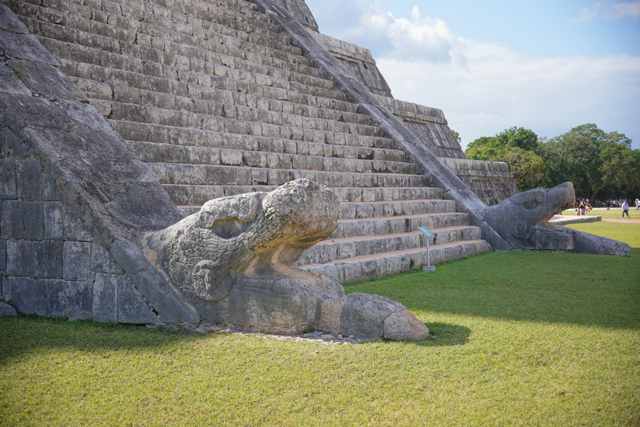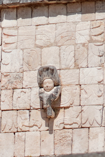 循著階梯朝高台望,旁側壁面其實有著飾帶,是肉眼已難辨析的豹鷹食心,戴著眼飾的斜坐人形,可能代表從冥界完成旅程的太陽。由於角度,當視線越過階頂的蛇頭與持旗手,祭殿門柱只顯了翻翹的蛇尾。殿牆的相對好觀察,堆疊的是雨神面具,有著很特色的勾捲長鼻。大幅的為羽蛇神,化為人形自蛇嘴往外看。至於一般都會提及的「Chacmool」,就得多拉開些距離,才能見它半躺於門前,以漠然回望我們的好奇。