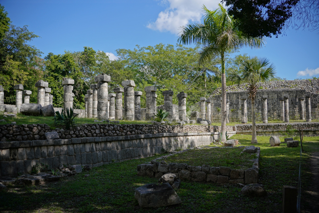 好奇讀著說明板,原來它本被門柱支著,中央還曾有人形坐鎮。且附屬的綴飾不僅如此,除了基本款的戰士浮刻,還包納了各行各業,有的可能是商人,有的手持羽扇一身華裝,似過得悠閒的貴族。這些之外,尚有頭部可拆,打扮得像羽蛇神的「Chacmool」,被以「雕柱之宮」(The palace of the carved columns)稱呼合情合理。但詭異的是,放眼望去,草棚後一片空乏,難道都被博物館收走了?