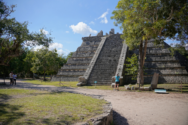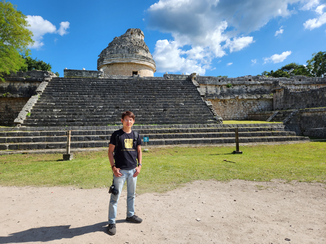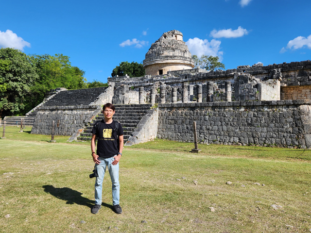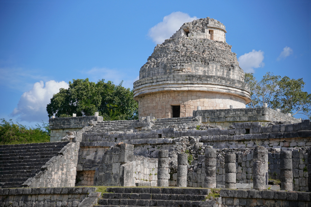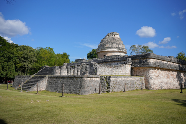 仰望著已大幅崩塌的祭殿,揣想裏頭格局及直探地底的深幽,我繼續朝南方走。那兒被推測為當時的學術研究區,包納數學、曆法、書寫、星象,最經典的便是「El Caracol」了。果真,沒幾步便見標誌性的圓塔在不遠處探首。三層高的它頂部雖已缺損,倒形構為別具美感的殘傷拱冠,招著人進前,而後賞望。