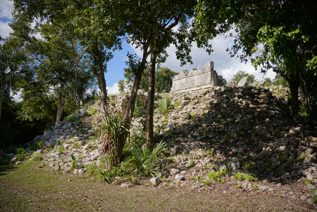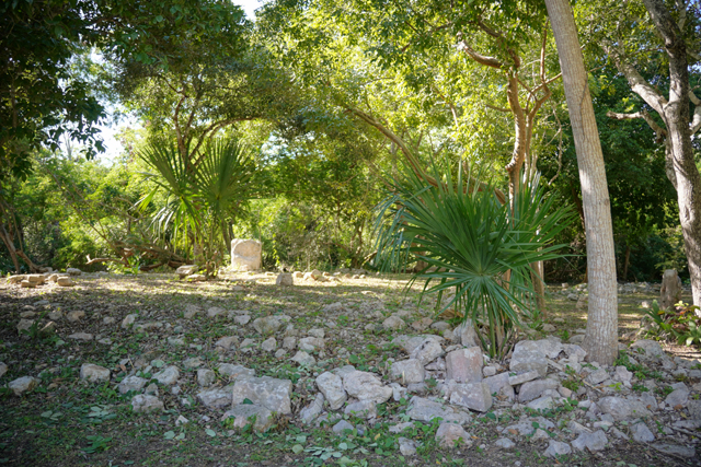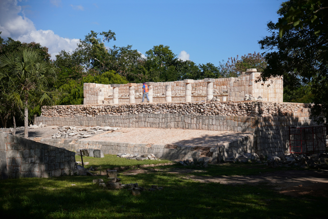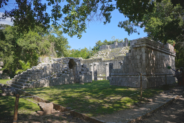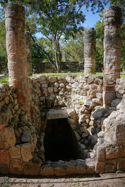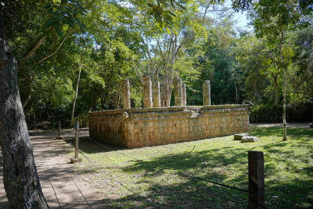 走入被標為「Sabre 10」的步道,這條顯然是對了,沒多久便能望見醒目的建築群,金字塔、三個方圓小壇,排列一線遙指方才被我略過的「Cenote Xtoloc」。即便以「羽蛇神金字塔」領首的那些宏偉建物很讓人直覺為政教中心,從說明板看,這邊才是盛期核心,並有著相仿的佈局。走至最末端的「墓穴平台」(Platform of Graves),它殘著蛇紋飾帶,台上的六根立柱頗費疑猜。否決了幾種推想後去看答案,不覺啞然失笑,它就是棟敞屋啊,只是屋簷不是石質就隨時光風化了,徒留支柱。而會被這麼稱呼,是因挖出了一些骨頭,不過由於湊不成組,學者較偏向它是用來納骨,而非專為某貴族所設。