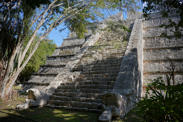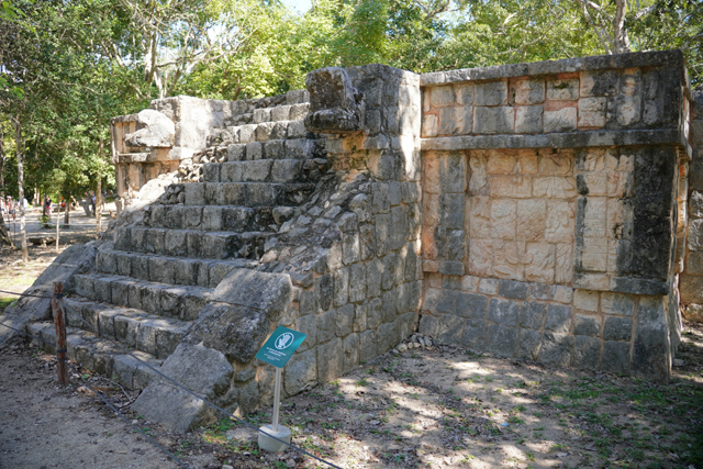 其西側的鄰居被名為「金星祭壇」,形貌也的確跟稍早訪過的那座相像,即便崩了許多,階頂蛇首也沒多少留下,壁面仍能辨出人形的「羽蛇神」從蛇嘴外望,編織紋蔓延。再過去的矮圓壇就不知用途了,因為沒標牌,只能自己亂猜是給祭司敬神祈舞,不然便是巧立名目,再多獻祭一些人。