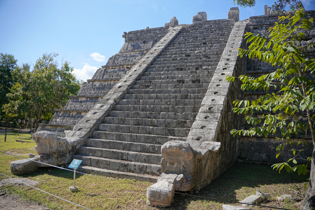 探過附屬的祭壇,我把視線轉向主體「納骨塔」(Ossuary),它比「羽蛇神金字塔」小,只有七重,雕飾卻毫不遜色。階邊兩道長蛇有著纏繞圖騰,或帶羽鱗,或泛雲紋。上段壁面也隱現刻繪,與說明板比對,都是些奇特造型。有的人披掛誇張羽飾,彷彿張了雙翅。有的為互望翼獸,額嘴噴吐烈焰。鄰近還孤立了一根方柱,照資料,其實是頂頭祭殿牆角的移築。