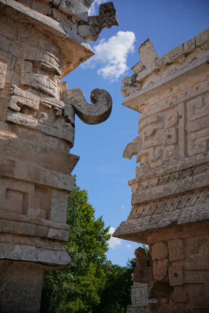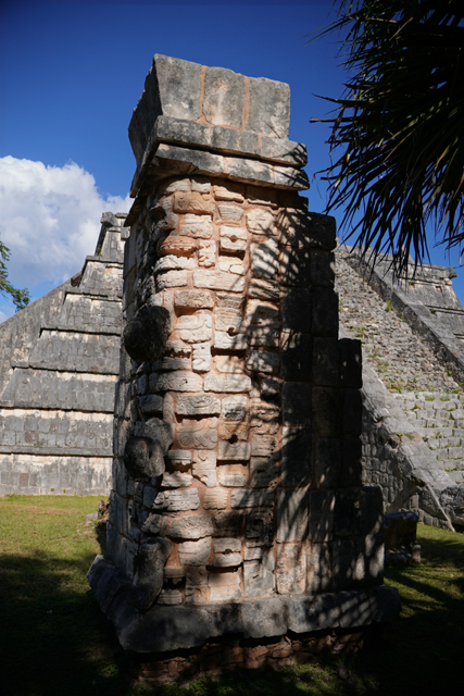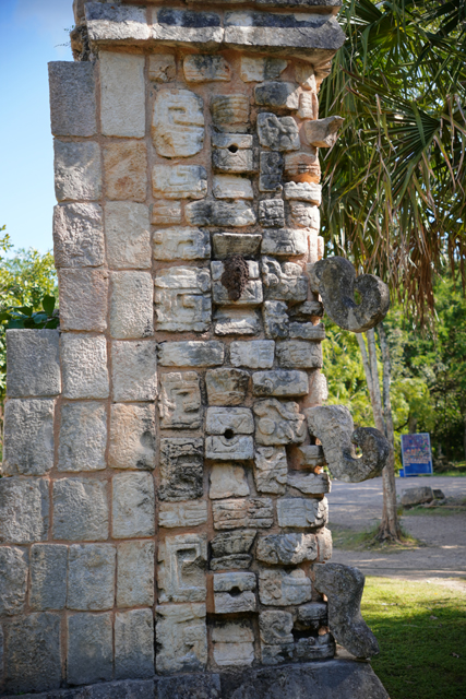 這根上頭滿滿紋刻,也不知是否藏有字符,畢竟「古典終結期」彷彿也斷了銘刻習慣,「奇琴依查」能找到的碑文相當少,而資料稱這區記有的是當中的最晚年代,公元998年。若跟著講解大隊,應就能得到老師通靈後的答案吧,然選擇脫隊的我,所見都呈刻花,只辨出邊角那些長鼻子面具為「雨神恰克」。