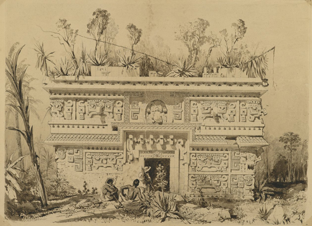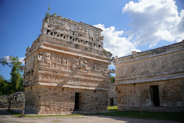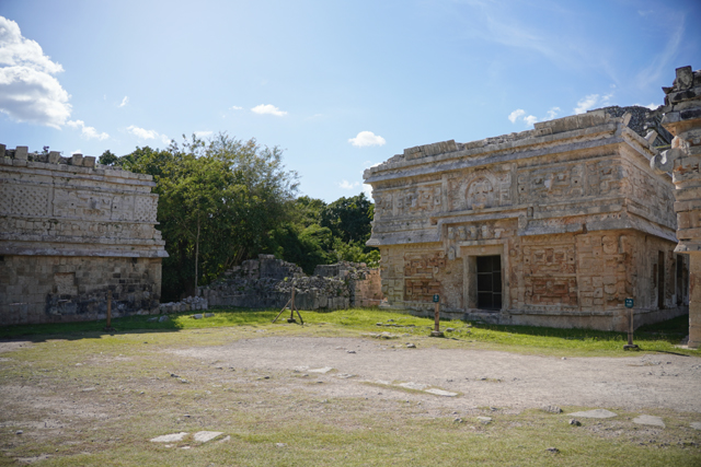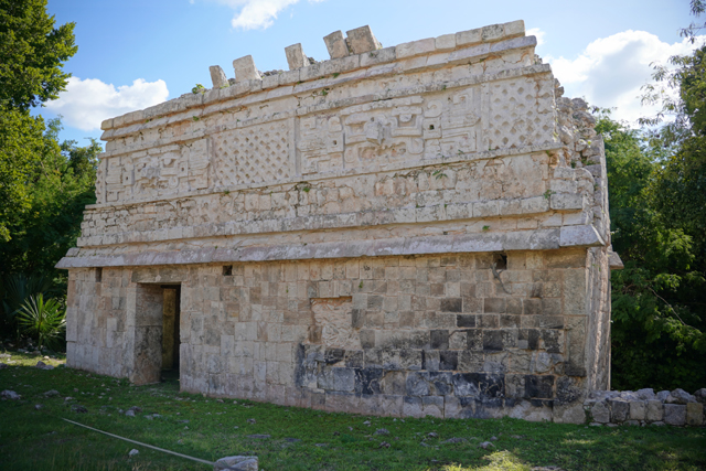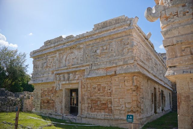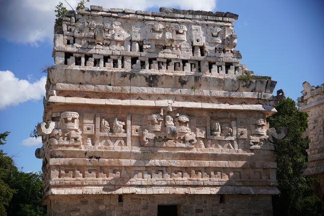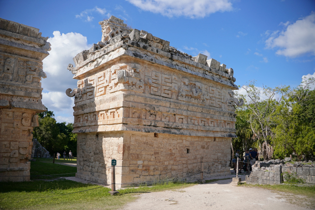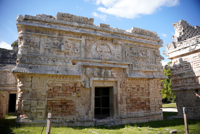 而鄰近一棟孤立小殿是這區的佼佼者,在渦紋波流間,有無數雨神「恰克」咧著嘴,以挑捲長鼻豐沛稜線。除此之外,正面還能看到兩個小龕各放了兩尊奇形物,它們其實是代表四方的神祇「Bacabs」,得帶點想像力才能看出各自為犰狳、蝸牛、烏龜及螃蟹。它很難得仍留有高高豎立的脊板,也因如此精緻的形貌,在這「修女院」中被順理成章名為「教堂」。