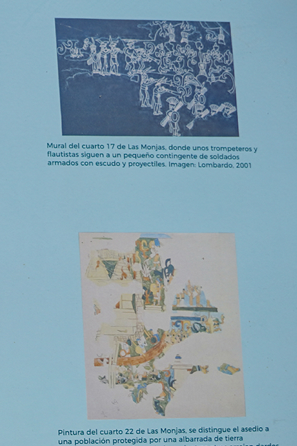 這火祭很可能與球賽相關吧,因為「紅屋」背後就是個小球場,有工人正辛勤修復另一側的觀眾席,環牆與六根門柱已重新堆起,再以想像力覆蓋簷冠,幾簇貴族們的坐望,便差不多能復刻當年榮景。說明板還附上了場邊的雕繪,構圖也是以球為中心的兩方隊伍,但解析度太低了,看不出是否同有相似的提頭與血柱化蛇。