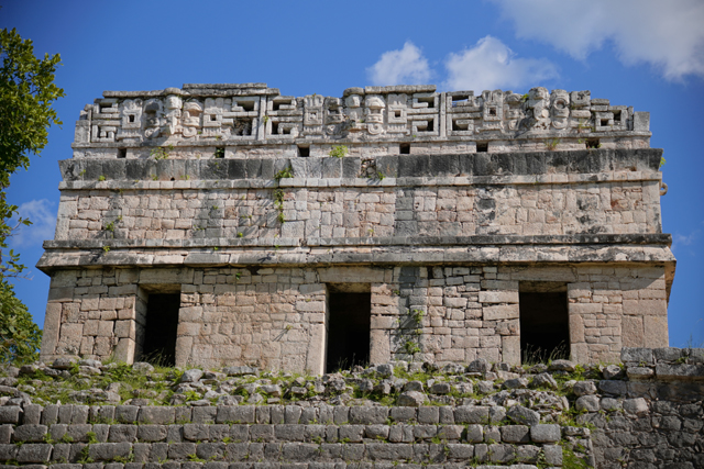 努力目不斜視行經「天文台」,偏偏西邊幾棟太顯眼,就忍不住又拐了過去。這區主體為「紅屋」(Casa Colorada),它立於階台,設有三門,冠頂飾帶以方形渦卷及雨神面具交相嵌。不免好奇名稱的由來,說明板卻描述得含糊,或許得進殿才能一睹殘留顏彩。無從得見的還有附屬的銘刻,上頭提及「Kʼakʼupakal」在九世紀舉行的火祭,看來他在位時的確是盛世,才能經營並雕琢了這麼一大區,並在各棟留下關於自己的記錄。
