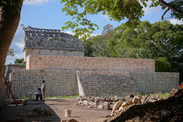 再稍往裡走,廣場北端有另座尚待處理,亂石丘上隱現祭殿的簷冠。它被標為「鹿屋」(House of the Deer),很讓人誤以為曾豢養著鹿,正解其實是相關彩繪的殘留。這滿有趣,因為沒聽說過中美洲有鹿啊,難道是被吃絕種了?然我事後再查,不僅翻不到圖,還寫著這畫現在已不見了,不曉得是發生何事。