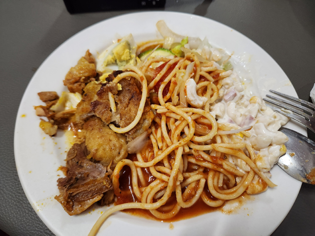從「奇琴依查」出來,下個點是領隊先前所提,用來補償「科巴」的網美景點「Ik Kil Cenote」。為了節約看菜單跟等餐的時間,安排了鄰近飯店「Hacienda Xaybe´h D´ Camara」的自助餐。進去就給了餐票,自己去吧檯選,不確定能否再點個第二輪,畢竟滿多品項看來都是我的地雷,胡亂指了義大利麵、蛋沙拉、煎魚,肚子有填到東西就好。