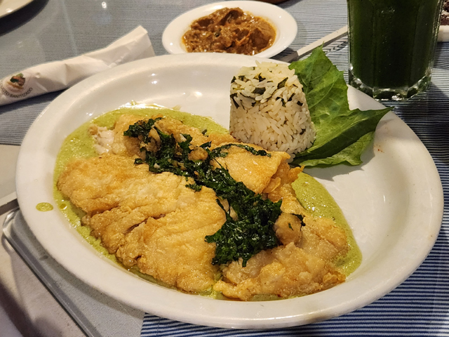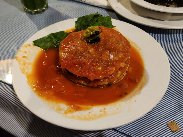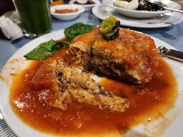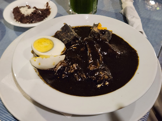 這家的玉米餅是現作,可以看到婦人在旁揉麵團。我一邊盯著一邊抱懷期待,結果當餐點上了桌,這個號稱以千層麵風格疊起的圓軟餅,夾餡顯然不是菜啊,也不知是廚房失誤,還是服務生沒聽懂我的英文。只能先安慰自己,前幾天點的素食料理都失敗,肉食應該比較出色。果真,這餡料雖為剁碎的角鯊肉,吃來完全沒我討厭的海鮮腥,佐著以番茄為基底的甜酸淋醬,很激發胃口。順便瞄了其他人點的,那之中一坨黑的「Relleno negro」看似墨魚汁料理,其實是將當地特色辛香料烤至黑糊狀。見點這道的美眉神色複雜,大家也好奇挖了一點,呃,只能說還好我打保守牌啊。