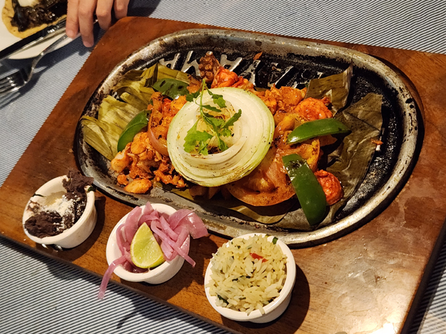 很幸運地,我們搶到了兩桌,接續的煩惱就是在眼花撩亂的菜單中作出抉擇。它有基本款taco的花式變衍,還有一類被標上「猶加敦經典」,但既只有吃一次的機會,便很自然先把範圍收束在特色菜。點開翻譯軟體,上頭給出的詞句幾乎有看沒有懂,老師以經驗給出的推薦,聽來也不適合我,猶豫很久,最後選了可以作素食的「Pan de cazón」。