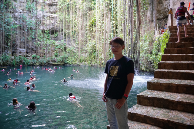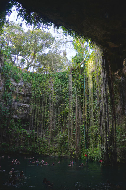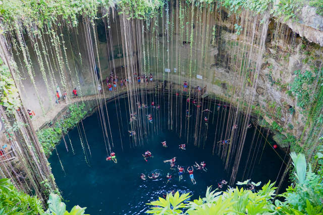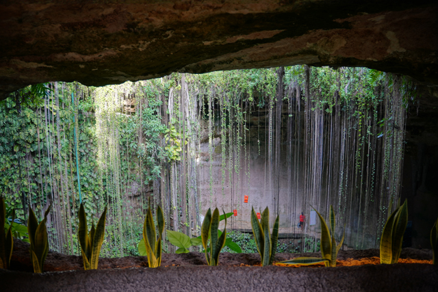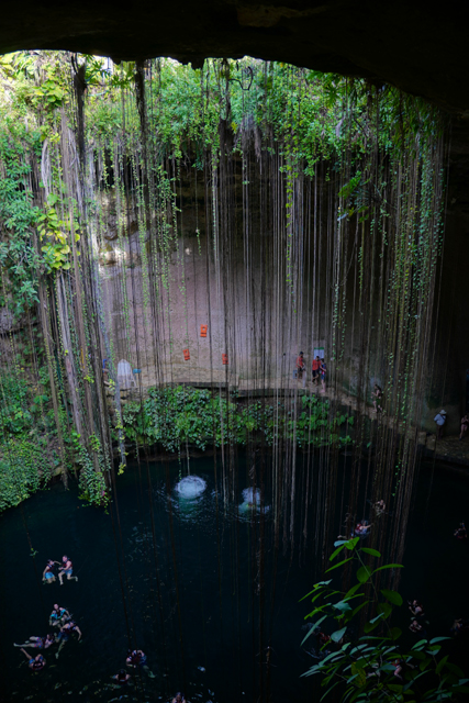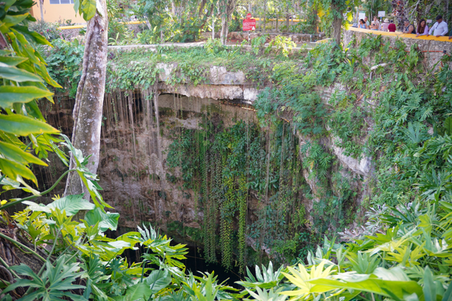 可能是已被徹底探勘,具考古價值的都收走了,目前就這麼轉生為娛樂收費景點。循著歡鬧聲往下望,它跟「奇琴依查」的「神聖天然井」有著相似模樣,但更深闊了些。除此之外,又多了綠意的巧手點綴,繁多植物不畏地險在岩壁攀生,長長的鬚根飄垂如簾,為其添增一色夢幻,難怪會成為「猶加敦」最熱門的「Cenote」。