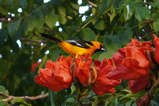 狂想完,即便領隊給的一小時還有很長可花用,逐漸開始主導的無聊把我帶了上來。隨興逛晃之際,發現不少團員已跟導遊、老師在咖啡廳閒嗑牙。見兩個美眉買了冰棒,我也有樣學樣入手一枝,然後邊咬邊賞鳥。牠不知是何品種,也非我一直想見的「鳳尾綠咬鵑」,亮橘身影與橙紅花朵將樹梢綴點出迷人火艷。