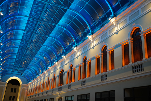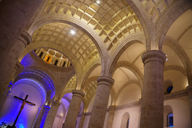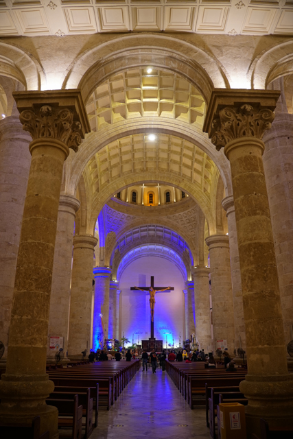 在這已超過九點的夜裡,它居然還燈火通明,開門迎客,大夥就好奇逛了進去。猜想是遇上聖誕節相關的晚會,因為有未散的民眾正跟疑似歌手的女生在壇前合照。本以為憑其歷史及位格,堂內該有些雕琢,怎料就跟外在一樣平實,不斷弧躍的柱拱及佈滿天篷的格框就是它最主要的飾綴了。
