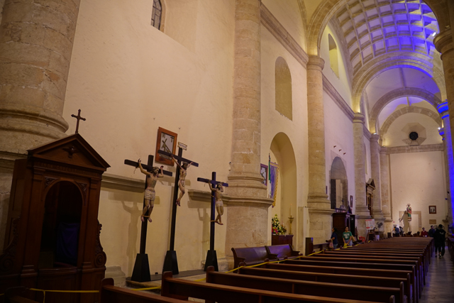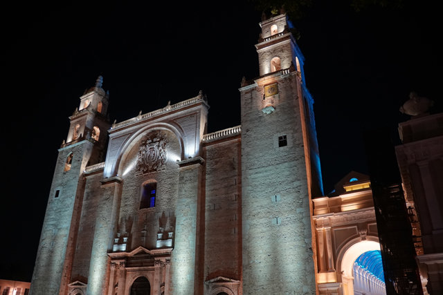 如此走至城心廣場,「梅里達主教座堂」在東側招引著視線。它建於十六世紀,是美洲第二古老的教堂,僅次於多明尼加的「肉身成道聖瑪麗亞聖殿座堂」。雖說使用了原本馬雅神廟「Temple of Yajam Cumu」的石材,可能有飾刻的都故意捨掉了,肉眼其實感覺不太出來,只覺它顯著灰白的粗獷。也很難拿歐洲建築流派將其歸類,畢竟所見僅兩座漸縮方塔疊築,中央立面勾了個大拱框。心處可說是它最華麗的部分,最早刻印了城堡與戴冠雄獅拼組的西班牙皇家盾徽,墨西哥獨立後,便將其改造成立於仙人掌的老鷹。再往下的山牆大門,則有彼得和保羅在兩側守望。