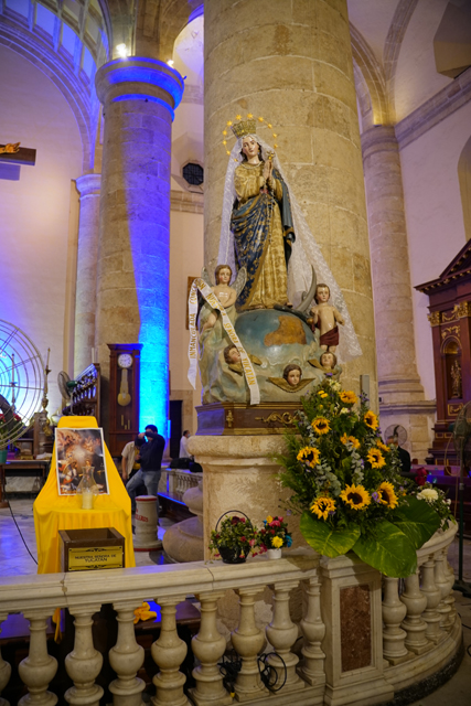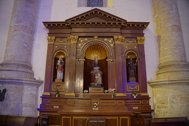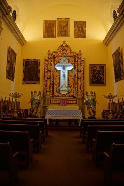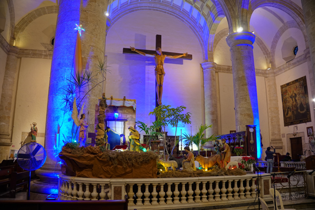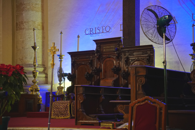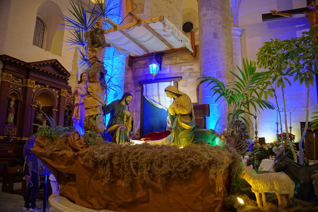 在環望中往前走,根據資料,這教堂是獻給「托雷多的聖伊德方索」,卻沒看到跟他有關的物事,素簡的主壇跟唱詩班前立起被釘於十字架的耶穌,側邊奉了華裝聖母,然後便是因應節慶,打造了結合馬槽誕生及三賢者來朝的場景。
