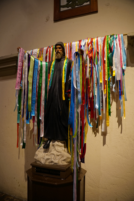 側廊擺設也顯然不能拿歐陸標準來衡量,零零散散的祭龕間,只有個禮拜堂多了些天使雕塑,以環列的畫像、綴金花藤繁飾的主壇輝爍視線。再者便是一尊名諱陌生的黎巴嫩聖人「Charbel Makhlouf」,他被掛滿了彩帶,似有著特殊敬獻儀式。