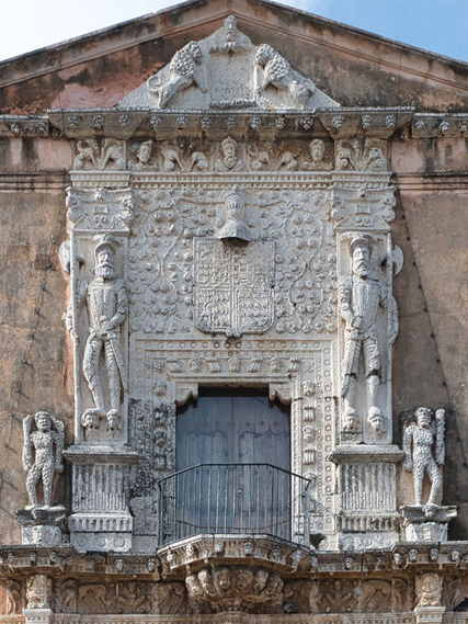 相對北跟東的漆色新燦,南邊樓閣斑駁許多,即便如此,它的妝點其實是最繁複的,幾座列窗都以少女柱撐起山牆,並鑲上盾徽。立面也堆疊得撩目,大門飾框浮凸之餘,頂上露臺亦攀綴了緻密花藤,兩側還立了西班牙軍官倨傲踩著頭顱,再於腳邊添上卑屈小野人。這樣的構圖泛溢著濃濃殖民意味,也的確,這棟可是「蒙特霍故居」(House of the Montejo),當年「Don Francisco de Montejo」征服了「猶加敦」,建立「梅里達」,為自己蓋棟豪宅理所當然,如今成了此城留存的最古建築。