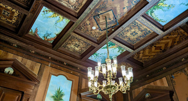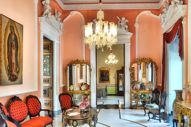 儘管拆毀馬雅遺跡的行為令人唾棄,看圖片,裡頭還是挺值得一訪,揉合了洛可可與文藝復興,客廳因此有著勾繞框邊、飾金傢俱,辦公室、臥房則藉木色顯得雅致。餐廳是最出色的,不僅將頂頭鑲板勾上墨色纏藤,又交錯了幾幅斑斕花葉,彷彿天窗映入的麗景。