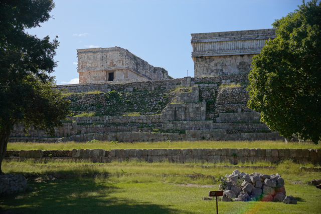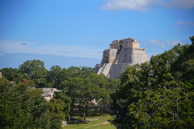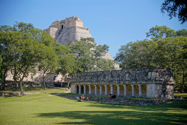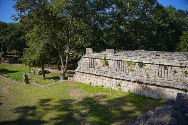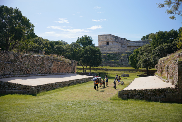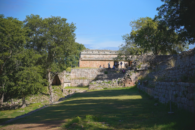 這不免勾起學者對用途的推想,由於馬雅神話裡,大地是由洋上巨龜乘載,不少祭壇也設計成類似模樣,這樣與土、水的連結,便很容易將思路導向農業,把它定調為相關祭殿,在季節到來時用來祈雨。但我想多數人應不在乎它的用途吧,畢竟當視線略轉,收攬的便是幅迷人景畫,球場闢開茂林,指向方才行過的「修女四合院」,南北兩殿此時併疊成瑰麗紋帶。而清朗藍天下,「巫師金字塔」斜側著身,一展它弧潤的軀線,頂廟繁雕宛如華冠胸綴。