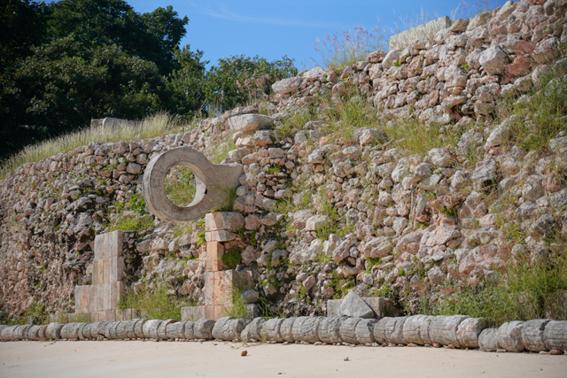 沉迷了一陣,隨大隊走出,這方向能見「烏斯馬爾」的球場,依留存的銘文,同是「Chan Chak Kʼakʼnal Ajaw」的手筆。或許是他比較偏好蓋宮塔吧,眼前這座不僅未顯吸睛雕琢,尺度也不大,跟「奇琴依查」的完全無法比。但也難保不是掉光的關係,畢竟在大幅崩落的壁面還留有蛇尾,被擱在牆腳的整條長蛇據說本該於上頭蜿蜒。這景況下,石環仍完整嵌著便是種奇蹟,我還在那想君王很壞心,插這麼低,根本是想讓球員早點死。後來才知石環其實是複製品啊,殘著紋刻的真品早被收去博物館了。