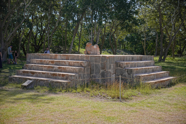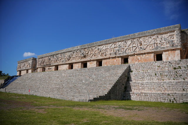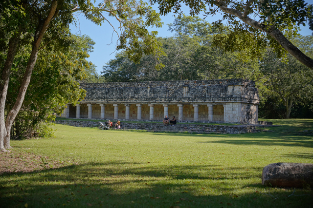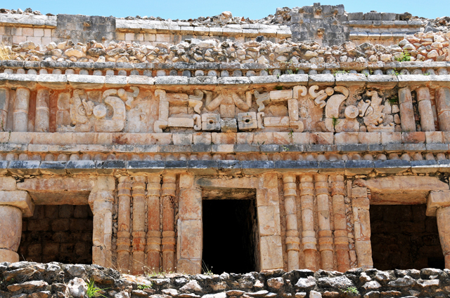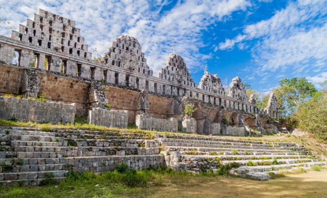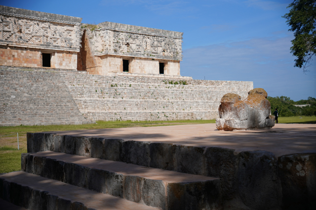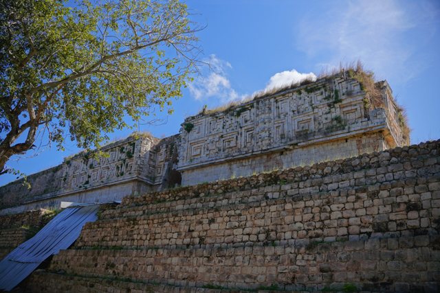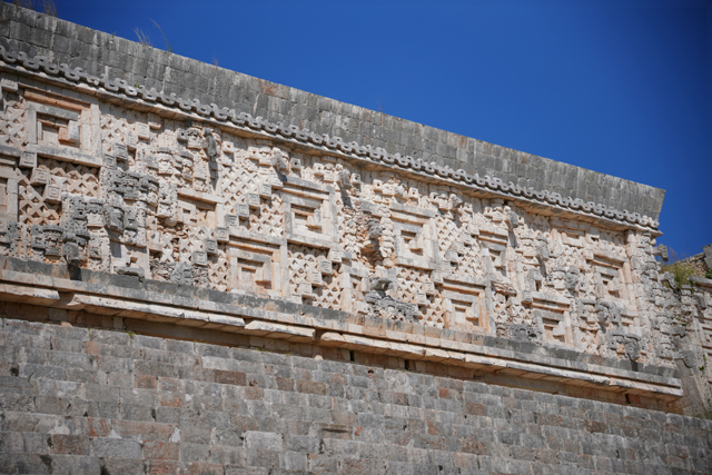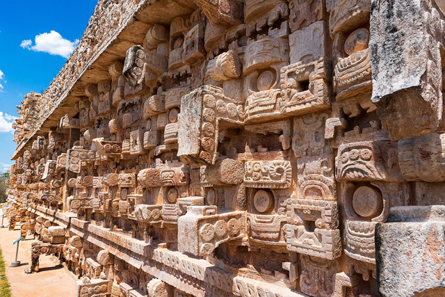 那之中規模第二大的「Kabah」,王宮區擁有相當奇特的「Codz Poop」,一般雨神面具多是間隔著點綴,它卻費工地貼滿整牆,不僅細節刻花令人讚嘆,遠望也壯觀。猜想是像成堆捲起的地毯,才被這樣稱呼。