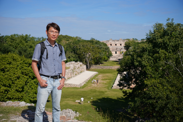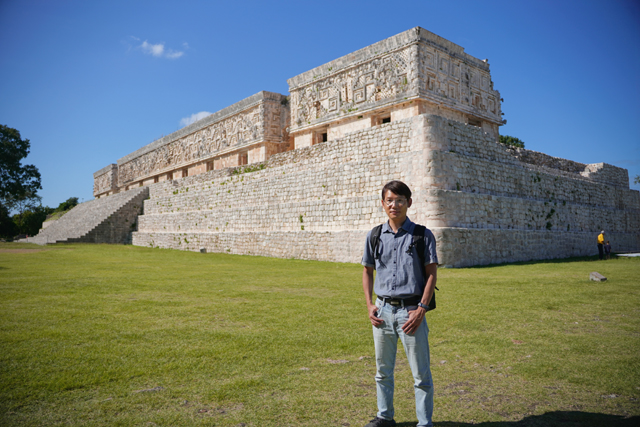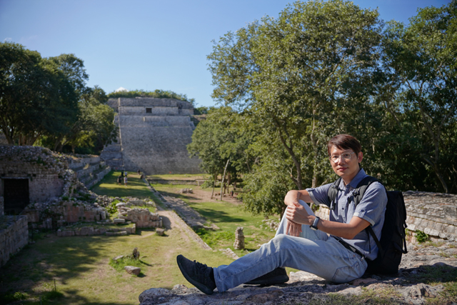 在推想與賞觀後,隨大隊折回「海龜之屋」,這兒的向南邊角剛好形成望台,近處為「總督宮」背後的層層落降,與不遠的殘屋框圍出長廣場,而廣場盡頭竟還有另座金字塔,高度堪比「巫師金字塔」。印象中沒什麼文章提及,地圖也僅以「Great Pyramid」稱之,即便名氣缺乏,高偉便自然形成目光焦點,何況尚有階台長劃與林樹伴點,大夥不約而同在這擺拍,連我也被殷勤拉入。